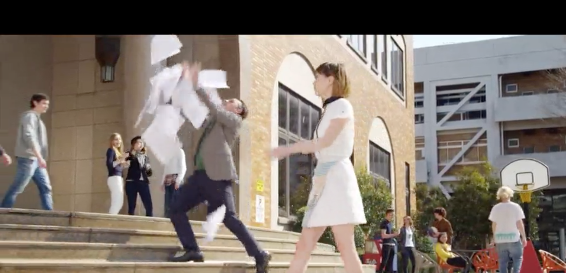 Acqua Models' Edison appears as the somewhat clumsy university professor climbing the stairs as his handfull of documents slip from his hand and fly in the wind. This is comical and clever commercial and Edison does a great job at being naturally clumsy.